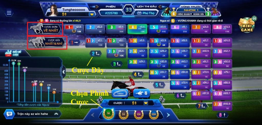 Đặt cược: Sau khi chọn ngựa, các thành viên sẽ đặt cược số tiền mà họ có thể đặt cược trên ngựa của mình. Các thành viên có thể lựa chọn tham gia đặt cược trên một ngựa duy nhất hay chọn nhiều ngựa.